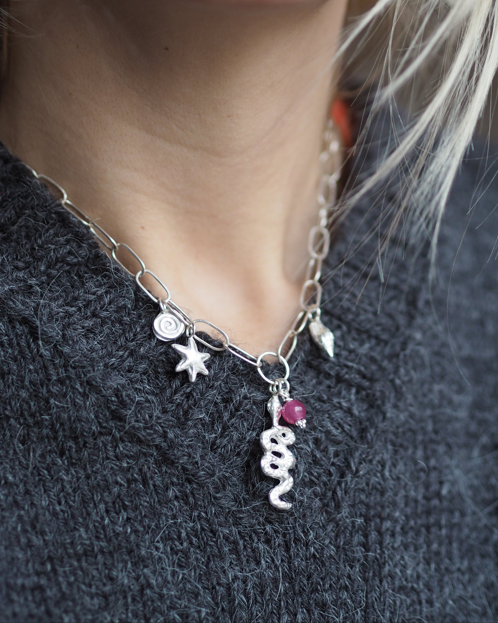 Paperclip chain with 5 charms; star, snake, shell, pink bead and spiral